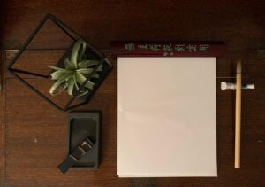 Ich räume den Schreibtisch frei und bereite mich vor: Tuschestift, Reibstein, Papier und ein paar Pinsel.